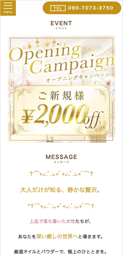 装飾や繊細なフォントで上品さと非日常的な空間を表現しています。