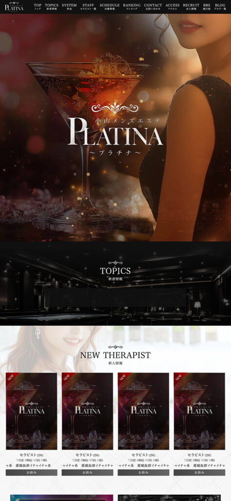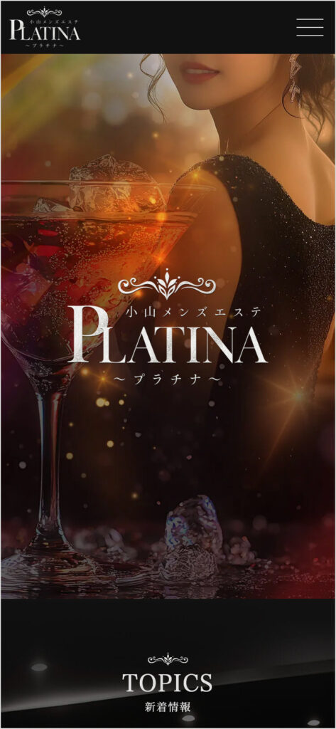 黒を基調とした背景に、ゴールドと深紅をアクセントカラーとして使用しました。ロゴや装飾には「きらめき」や「光沢感」をあしらい、ファーストビューではカクテルの写真を配置し、夜の贅沢な時間をイメージしつつ、ラグジュアリーなバーを連想させる雰囲気を表現しました。
