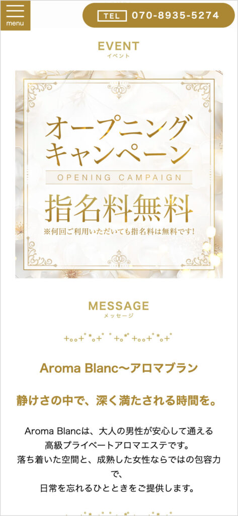 Aプラン Aroma Blanc〜アロマブラン 様 実際のHPを見る デザイン・機能について 白を基調とした落ち着きのある配色で、清潔感と上質さを感じられるデザインに仕上げました。 控えめで洗練された装飾により、癒しと安心感を演出しています。 全体を通して派手さを抑え、大人の女性にふさわしい上品で穏やかな世界観を大切にしたデザインです。